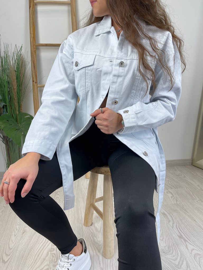 Delší džínová bunda s páskem v bílé barvě.