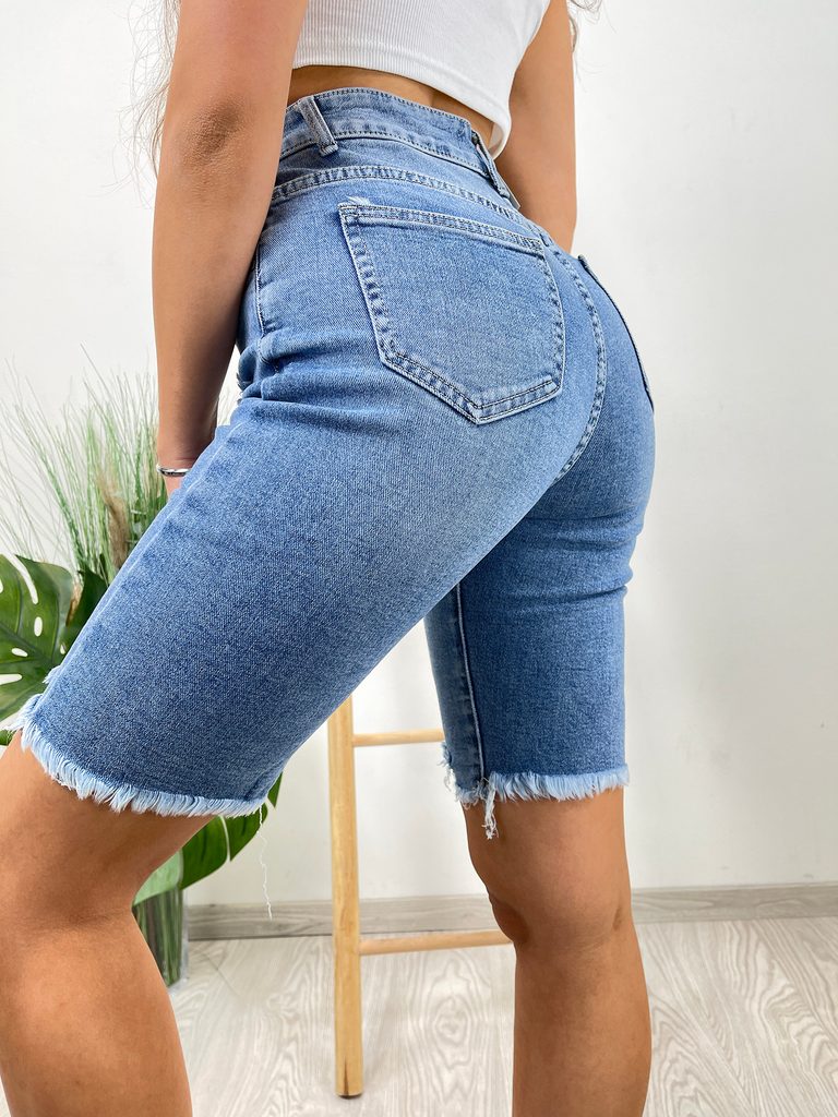 Modré lehce elastické džínové kraťasy s trháním.