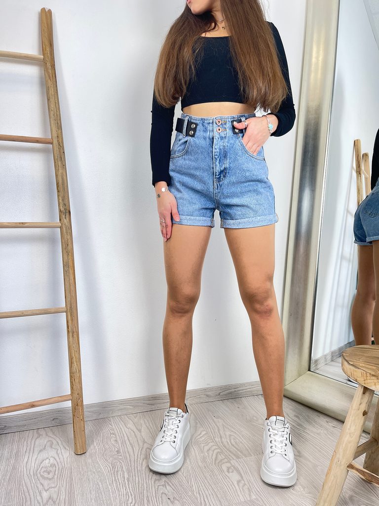 Džínové kraťasy s vysokým pase a páskem se cvočky modré