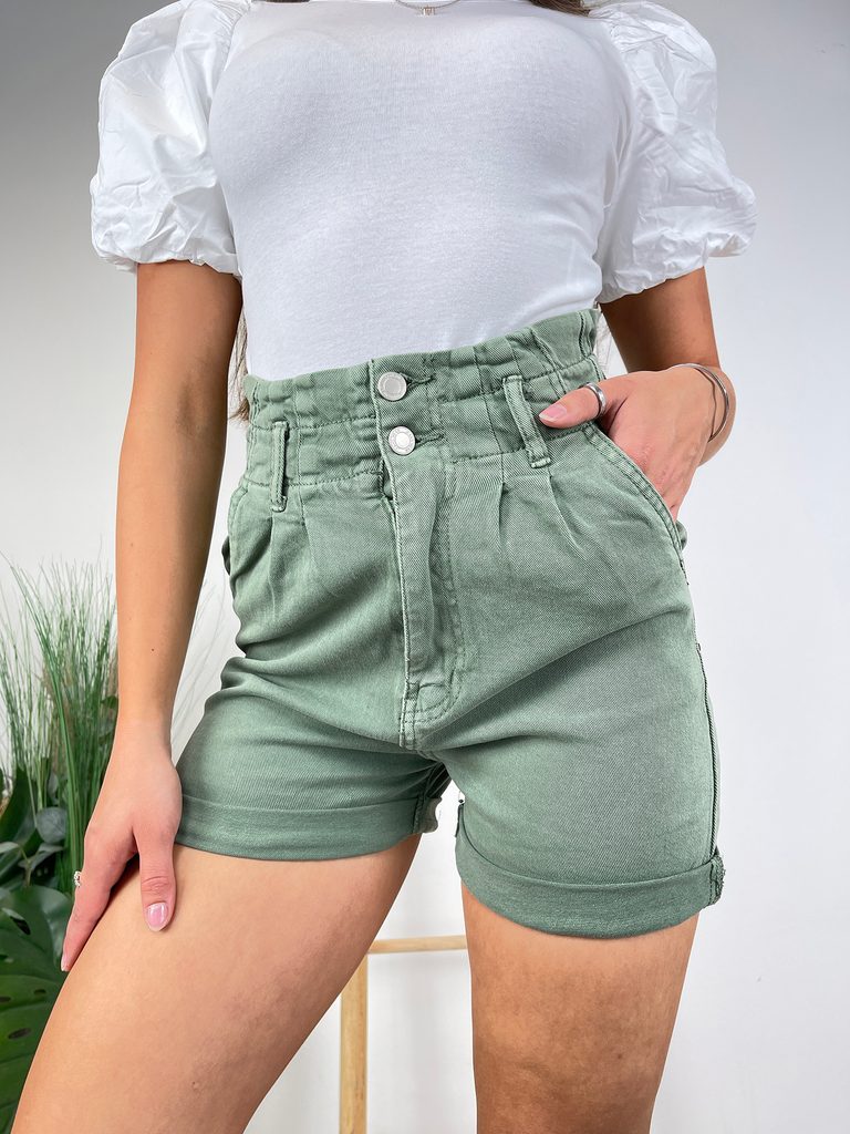 Khaki lehce elastické džínové kraťasy s vysokým pasem a gumou a ohrnutou nohavicí.