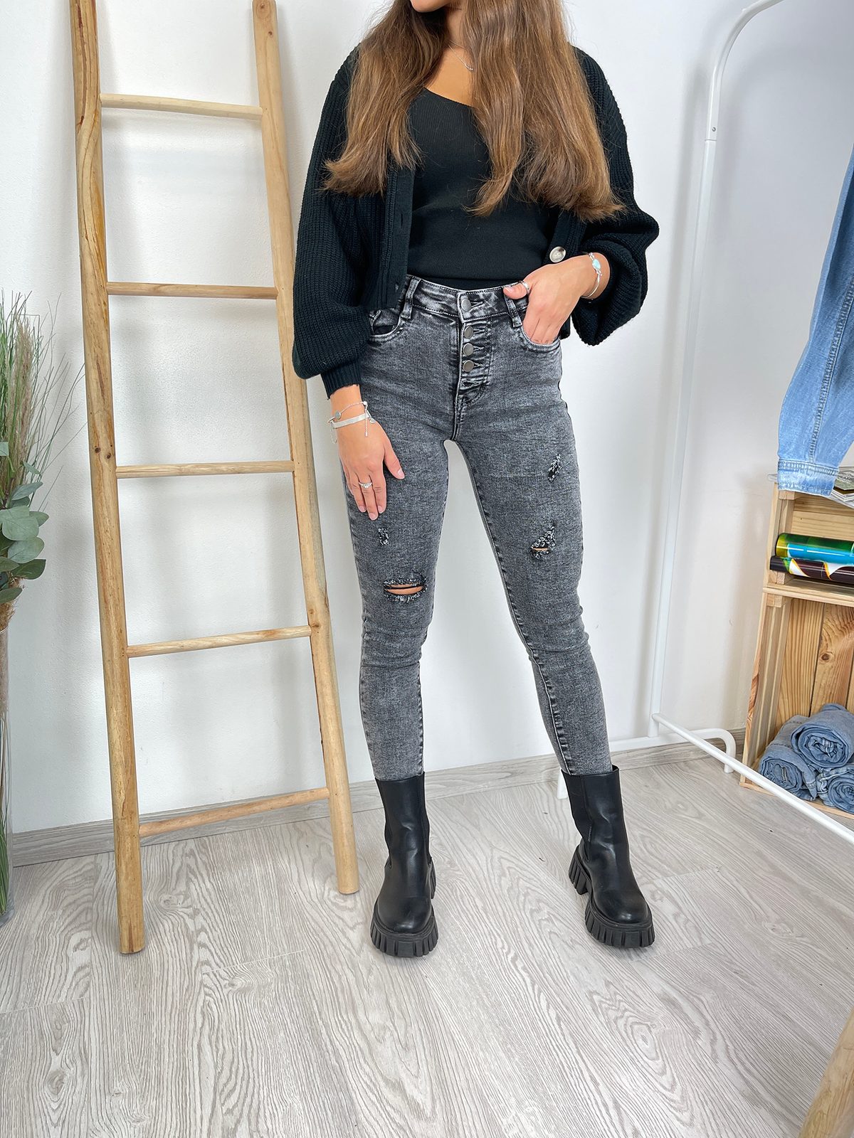 Skinny džíny se zapínáním na knoflíky a trháním šedé